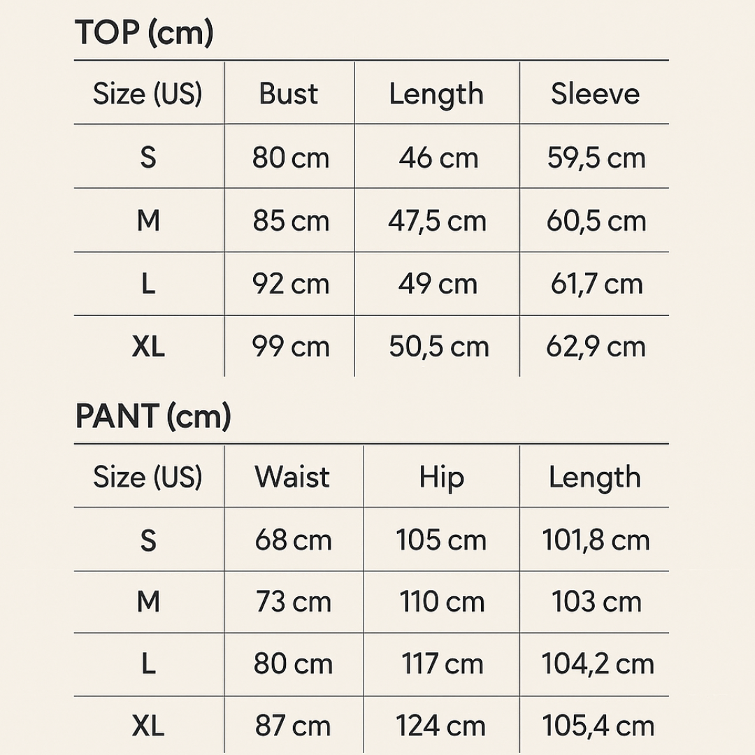 The set fits true to size with a relaxed, slightly fitted silhouette. If you prefer a more oversized or slouchy look, we recommend sizing up. You can also refer to the size chart for exact measurements.